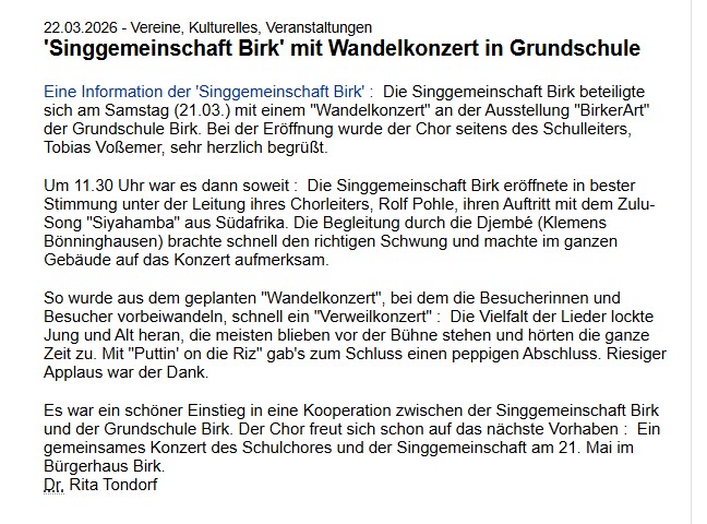 Das Konzert war der Singgemeinschaft Birk und Rolf Pohle eine Herzensangelegenheit. Umso dankbarer sind wir, dass wir so viel Freude bereiten konnten – und zutiefst ergriffen über die Rückmeldungen.