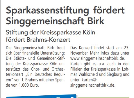 Die Singgemeinschaft Birk freut sich sehr, dass uns das Lohmarer Blasorchester als Organisator eingeladen hat, am Neujahrskonzert Lohmar am 15.01.2023 in der Jabachhalle mitzuwirken. Die Sängerinnen und Sänger haben gerne zugesagt, gemeinsam mit anderen Kulturschaffenden dieses schon traditionelle Neujahrskonzert unter der Schirmherrschaft der Bürgermeisterin zu gestalten und sich beim Lohmarer Blasorchester herzlich für die Organisation bedankt.